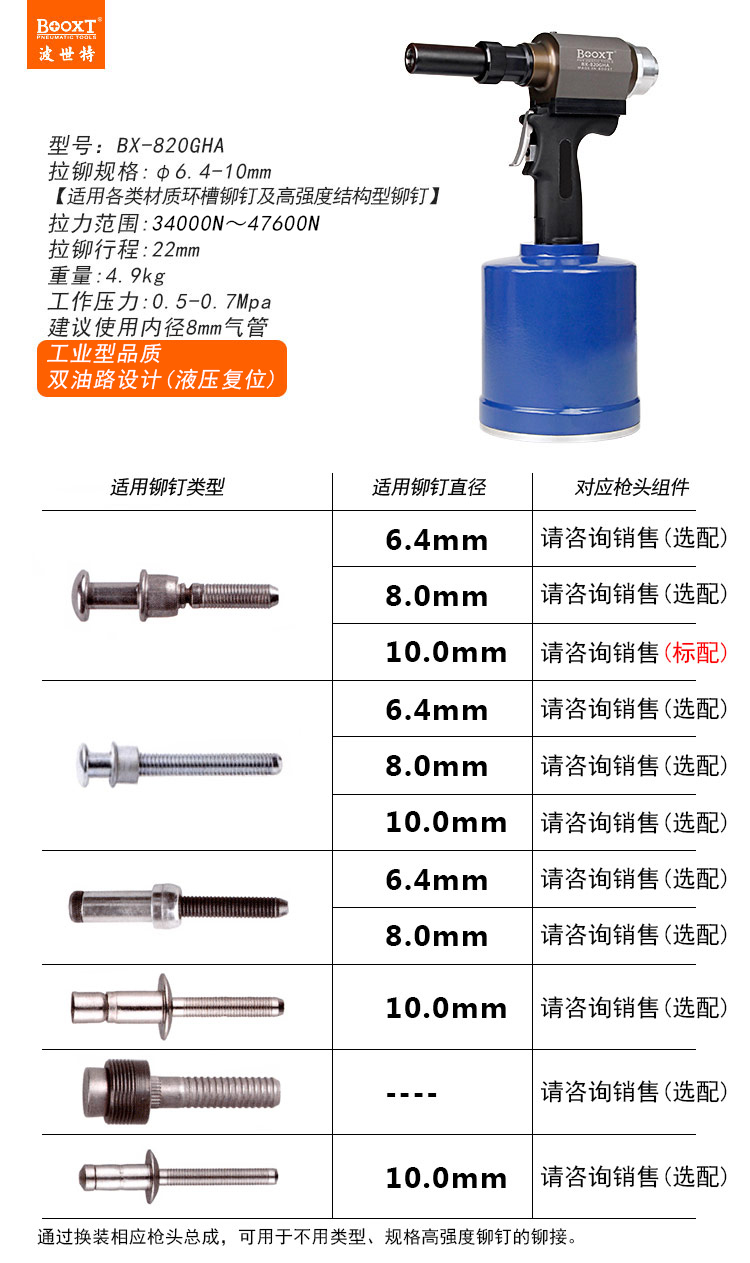 4.品種齊全,適合不同規(guī)格,不同強(qiáng)度的鉚釘。