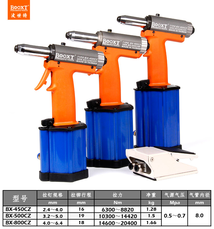 東莞市強勁五金工具有限公司提供臺灣BOOXT波世特品牌氣動工具,氣動拉鉚槍BX-450CZ廠家直銷,首件享特價。咨詢熱線:4008301980