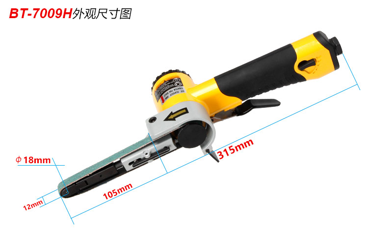 • 產(chǎn)品參數(shù): 砂帶尺寸:10×330mm; 空載轉(zhuǎn)速:16000rpm; 工具長(zhǎng)度:315mm; 工具重量:0.92kg; 耗 氣 量:0.45m3/min; 使用工作氣壓:0.65Mpa; 推薦使用內(nèi)徑8mm氣管; 平時(shí)使用應(yīng)多加氣動(dòng)油保養(yǎng)。 【經(jīng)濟(jì)型】