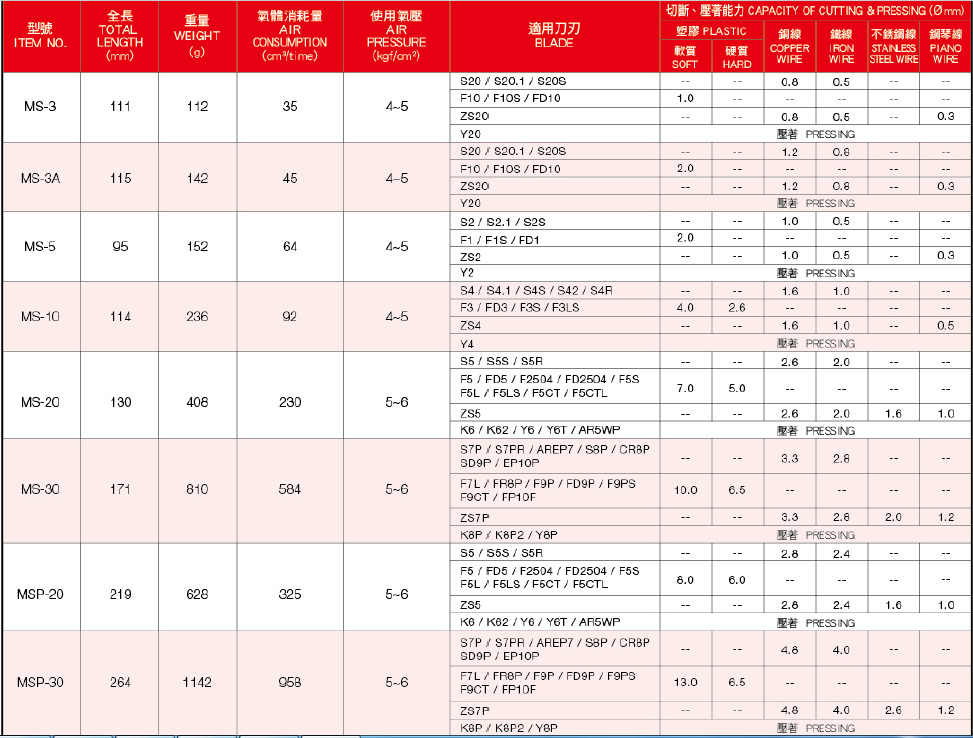 MS-10刀頭選擇請參考下表: